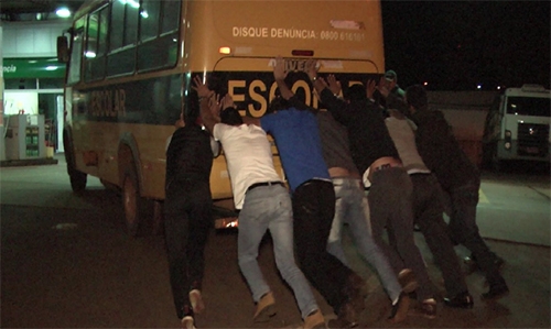 Microônibus escolar da prefeitura de Janiópolis ficou sem combustível, nesta terça-feira à noite, na BR-369, nas proximidades da Unicampo. Como não podia “passar” nem pedir ajuda às cartas, o motorista não teve outra saída: pediu ajuda aos universitários, que empurraram o “businho” até o posto junto ao Tio Patinhas.