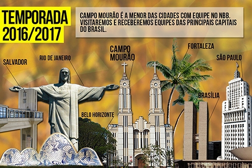 Material preparado pela direção do Campo Mourão Basquete mostra que a cidade é a menor do Brasil a ter um time no NBB. Com 93 mil habitantes, Campo Mourão vai enfrentar gigantes como São Paulo, Rio de Janeiro, Belo Horizonte, Salvador, Fortaleza e Brasília. Do Paraná, nem Curitiba tem equipe lá. É o interiorzão contra as maiores capitais do País. E cá pra nós: ficou bonita a Catedral São José no meio das metrópoles, não ficou?...
