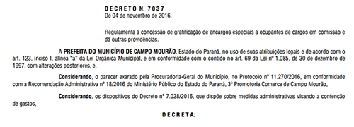 Saiu nesta sexta-feira o decreto que regulamenta as gratificações para cargos em comissão. Ele prevê 100% para os diretores (CC-2) e 80% para chefes de departamentos (CC-3). O decreto foi publicado após recomendação do Ministério Público. Por causa dela, semana passada, a prefeitura tinha cortado todas as gratificações dos comissionados.