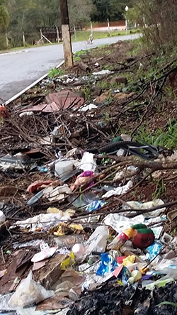"Lixo jogado às margens da estrada para o Barreiro das Frutas, nos fundos do Parque do Lago. Repare que ao fundo é possível ver o pontilhão sobre a barragem do Rio do Campo".