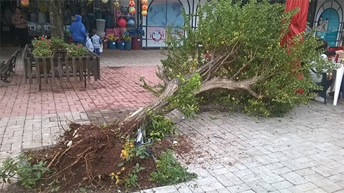 Se já não bastassem as árvores que são derrubas pra lá e pra cá, ainda aparecem motoristas-motosserras. Essa árvore aí, no calçadão, foi derrubada por uma camioneta na madrugada de sexta-feira.