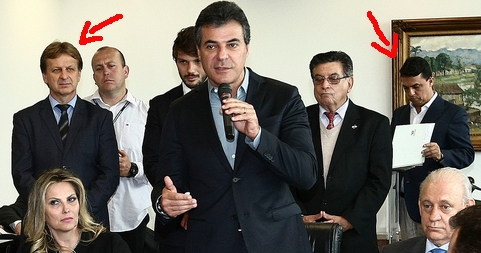 O governo do Estado anunciou nesta sexta-feira a liberação de R$ 46,6 milhões para 25 municípios. Os recursos são financiamentos para melhorias urbanas. Nenhuma prefeitura da região foi incluída, mas a cerimônia no Palácio Iguaçu teve gente da região. Repare ao fundo o mourãoense Tino Staniszewski (presidente da Codapar) e o goioerense Betinho Lima (assessor de Ratinho Jr).