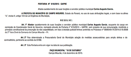 Foi publicada nesta sexta-feira a portaria que “afasta cautelarmente” Carlos Garcia da Coordenação Geral da prefeitura.