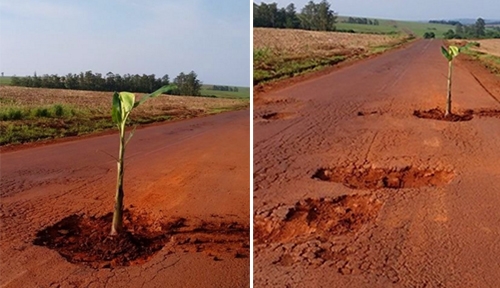 Usuários da PR-180, entre Quarto Centenário e Nova Aurora, plantaram uma bananeira num dos buracos da pista. A rodovia está cheia deles. Os motoristas também reclamam do estacionamento, que “sumiu”, e da falta de sinalização.