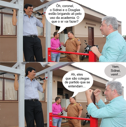 Olha aí mais cliques da Estação Saúde instalada no 11º BPM. Foi um pedido do vereador Sidnei Jardim ao secretário de Estado Douglas Fabrício (Esporte e Turismo). Por isso mesmo, eles foram conferir os equipamentos da academia. Na foto, Douglas orienta Jardim nos exercícios, enquanto, ao fundo, o comandante do batalhão, tenente-coronel Mauro Lúcio dos Santos concede entrevista a TV Caiuá.
