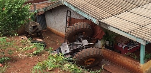 Como é que esse trator foi parar aí e ainda assim, de cabeça pra baixo? Calma que tem explicação. Acima desse barranco fica a PR-082, entre os dois trevos de Quinta do Sol. O trator teria sido fechado por uma carreta e veio morro abaixo. O contudor quebrou um braço, mas foi por sorte que o maquinário agrícola não caiu sobre a casa, “apenas” danificou uma parede. O caminhão que provocou o acidente deu no pé.