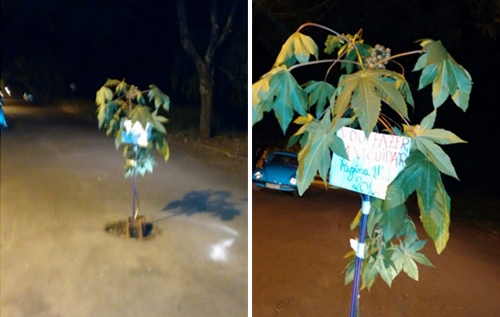 Rua Franz Kaiser, mais conhecida como “Rua Seis”, no jardim Copacabana. Morador “plantou” pé de mamona e deixou recadinho para a prefeita Regina Dubay para protestar contra buraco. Valdecir