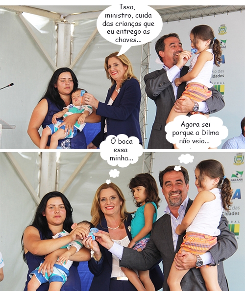 Os cliques são desta quarta-feira, quando o ministro da Integração Regional, Gilberto Occhi, e a prefeita Regina Dubay fizeram a entrega das chaves do conjunto Fortunato Perdoncini, em Campo Mourão. Aliás, entregaram as chaves com um das mãos, porque a outra teve que ser usada para segurar as crianças...