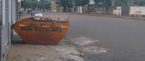 “Na rua Guarapuava, centro de Campo Mourão, a caçamba de entulhos é deixada sobre a calçada”.
