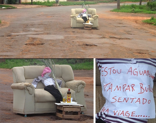 Os protestos bem humorados contra buracos nas ruas estão cada mais mais aprimorados. Esse aí vem de Goioerê, na rua Carlos Scarpari, perto da Aceng. “Estou aguardando tampar buraco sentado”, diz o cartaz na camisa do boneco, que fica num sofá, no meio da rua. Tem “mesinha de centro”, cerveja e até um Velho Barreiro no cenário.