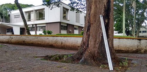 O descarte irregular de lâmpadas fluoresentes não perdoa nem a prefeitura. Olha só onde foram deixar essas aí: encostadas numa árvore bem na esquina do Paço Municipal 10 de Outubro.