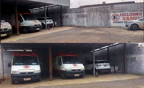 O aviso no muro parece bem claro ao dizer que o estacionamento é somente para as viaturas do Samu. Será que esse carrão é uma nova aquisição para atendimento das ocorrências?