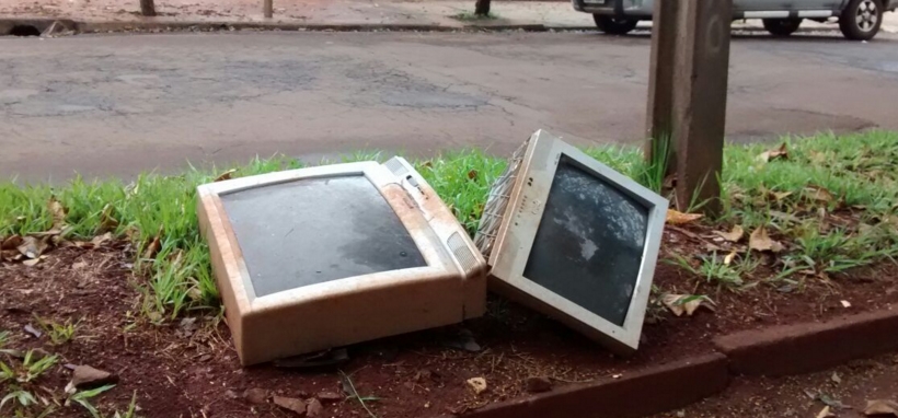 Duas televisões velhas foram jogadas no canteiro central da av. Guilherme de Paula Xavier. Isso é bem em frente ao ambulatório da Saúde.