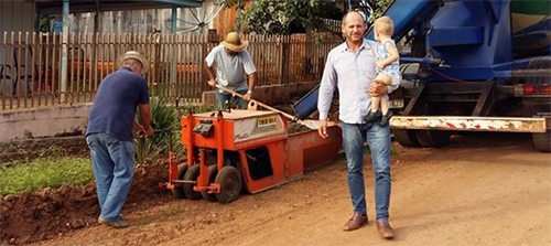 O prefeito de Barbosa Ferraz, Gilson Cassol, usou as redes sociais para informar que, com o tempo firme, foi possível dar início as obras de pavimentação com pedras irregulares na av. México. Teve foto e tudo no Facebook. Repare que Cassol fez pose com o filho no colo.