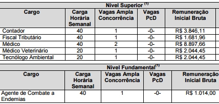 As vagas são para contador, fiscal tributário, médico, veterinário, tecnólogo ambiental e agente de combate a endemias.