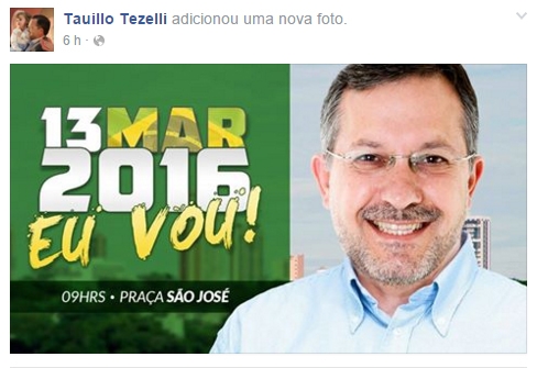 O ex-prefeito Tauillo Tezelli, pré-candidato a prefeito de Campo Mourão pelo PPS, está animado com a manifestação deste domingo. Ele preparou até uma arte e postou no Facebook para dizer e “vai” ao protesto. Nos comentários sobre a postagem, o ex-prefeito defendeu a saída da presidente Dilma. “O impeachment está na Constituição”, frisou.