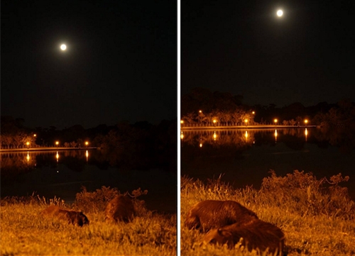 Capivaras no Parque do Lago, em Campo Mourão, sob o brilho da lua cheia, neste sábado à noite.