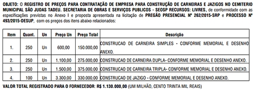 Você sabe quanto custa a construção de um túmulo no Cemitério Municipal de Campo Mourão? A prefeitura licitou uma empresa para isso. Os preços foram os seguintes: R$ 600 a carneira simples: R$ 1,1 mil a carneira dupla e R$ 1,5 mil a carneira tripla. Já a construção de um jazigo ficou por R$ 3,3 mil. Os preços valem até o fim do ano. Pelas novas normas, só a empresa licitada pode fazer esse trabalho. O cemitério não permite mais enterros em covas de terra.