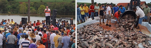 O que é isso, o prefeito de Boa Esperança, Claúdio Gotardo, fazendo um comício? Parece, mas não é. Gotardo está discursando durante a distribuição de peixes, que está se tornando uma tradição no município na Semana Santa. Este ano foram cinco toneladas de peixes. Tudo criado no Lago Municipal. Cada família recebeu dois peixes, numa média de quatro a cinco quilos de carne.