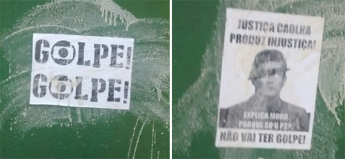 Não só de apoio vive o juiz federal Sérgio Moro em Campo Mourão. “Justiça caolha produz injustiça. Explica Moro por que só o PT?”, diz panfleto colado em locais públicos da cidade. Esses aí estão no muro do colégio Marechal Rondon, no centro. Um deles usa a palavra “golpe” ilustrada com a logomarca da Rede Globo. Também não faltou quem criticasse a “sujeira no patrimônio público”.
