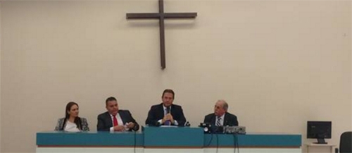 A solenidade que marcou o encerramento oficial do cadastramento biométrico na comarca de Campo Mourão aconteceu no salão do júri. O pessoal da Justiça Eleitoral ficou na mesa principal, os juízes da comarca ficaram no banco dos jurados e os prefeitos Lola Poera (Janiópolis) e Regina Dubay (Campo Mourão) sentaram nas cadeiras reservadas aos réus. Sorte de Mauro Slongo (Luiziana), que chegou atrasado e ganhou outro lugar para sentar.