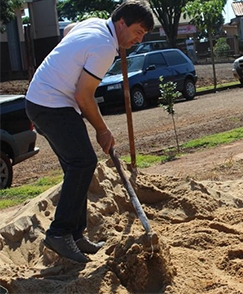 Teve mutirão no último sábado, em Luiziana, para terminar as obras de ampliação do posto de saúde. Todo mundo trabalhando como voluntário. Não faltaram políticos, como o vereador Armando Marques Rufino e o prefeito Mauro Slongo. Olha o prefeitão aí, mexendo com a areia. Viu só, não basta ser prefeito, tem que participar...