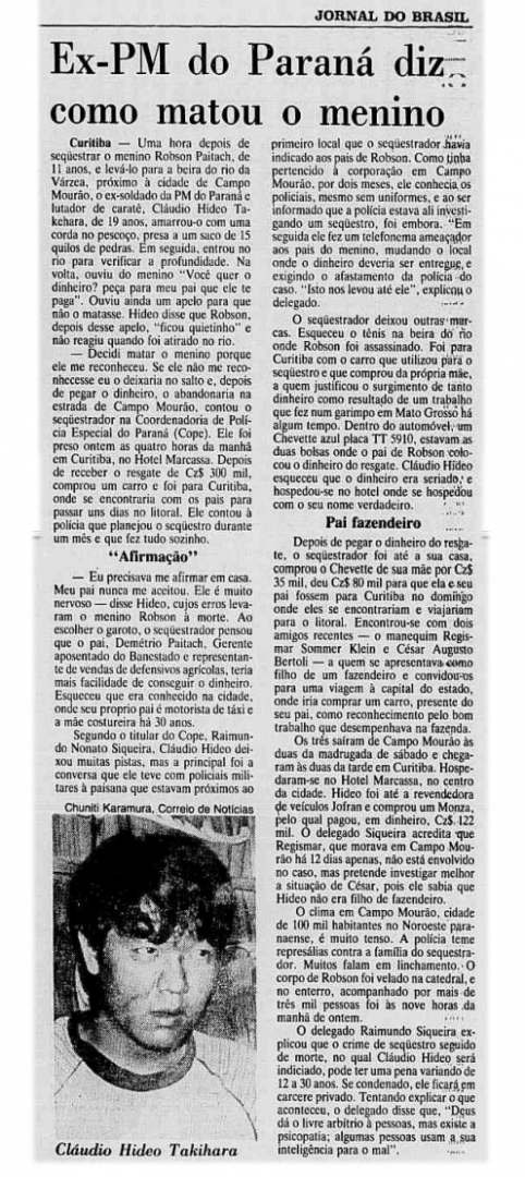 O crime foi marcado pela crueldade. Robson Paitach foi jogado no Salto Santa Amália, no rio da Várzea, amarrado a um saco cheio de pedras. Vivo! O próprio sequestrador contou que o menino pediu para não ser morto. Mesmo com a morte, Cláudio cobrou o resgate de 300 mil cruzados (cerca de R$ 250 mil em dinheiro de hoje). Em Curitiba, comprou um GM Monza por 122 mil cruzados. O Jornal do Brasil, do Rio de Janeiro, de 15 de abril de 1986, contou a história.