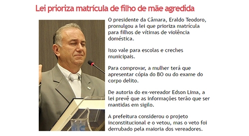 A lei que prioriza a matrícula em escolas e creches de filhos de mães que foram vítimas de violência doméstica é de autoria do vereador Edson Lima, no curto período em que substituiu Pedrinho Nespolo.
