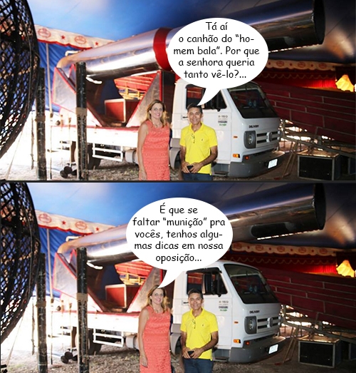 A visitia que fez ao Circo Portugal Internacional, semana passada, a prefeita Regina Dubay conheceu de perto o canhão em que é disparado o “homem bala”. Ah, um desses na prefeitura para se livrar de membros da oposição, hein? Em tempo: o circo está instalado perto da rodoviária.