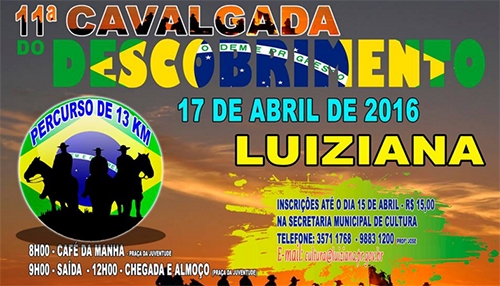Luiziana – Acontece neste domingo (8h) a 11ª Cavalgada do Descobrimento. A saída será na Praça da Juventude, com um percurso de 13 km. Interessados devem se inscrever até sexta-feira na prefeitura. A inscrição custa R$ 15. Informações: (44) 3571-1768 ou 9883-1200.