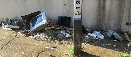 Em Campo Mourão, calçada da rua Silvério Farago, no Parque São João, virou depósito de televisores velhas e quebradas.