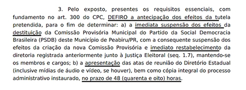 A liminar foi dada pelo juiz Paulo Eduardo Marques Pequito, da comarca de Peabiru. Entre outras coisas, ele pede que em 48 horas o diretório estadual do PSDB apresente a ata da reunião que tratou da destituição da provisória.