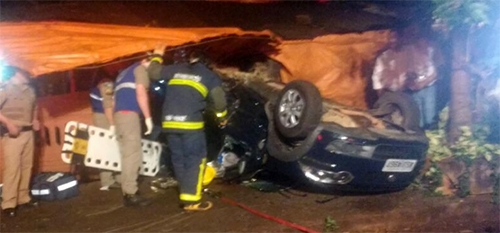 Pálio capotou neste domingo à noite, após ser atingido por Astra, no cruzamento das ruas Bela Vista e D. Jaime Luiz Coelho, no Lar Paraná. Cinco pessoas ficaram presas nas ferragens, algumas com ferimentos graves. O motorista do Astra não prestou socorro e foi encontrado pela Polícia Militar na Central Hospitalar.