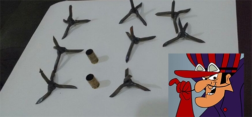 Você sabe o que é isso? São ganchos usados por bandidos para furar os pneus das viaturas da Policia Militar. Esses aí foram deixados próximos ao destacamento da PM de Fênix, na madrugada de quarta-feira, enquanto o bando explodia o caixa eletrônico da agência do banco Itaú. E a gente achando que isso só era artimanha do Dick Vigarista para tentar vencer a “Corrida Maluca”...