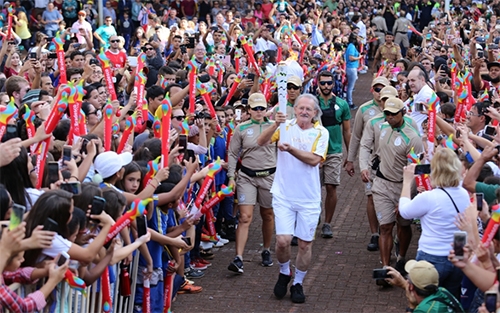 O veterano desportista Itamar Tagliari chega com a tocha olímpica na praça São José e é recebido por uma multidão, principalmente crianças. Foi nesta quarta-feira, quando a chama olímpica passou por Campo Mourão. Onze pessoas conduziram o fogo na cidade, sendo que Itamar foi o último.