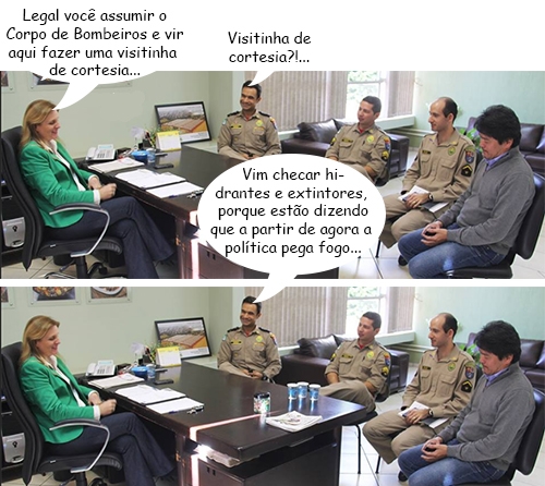 Os cliques são desta sexta-feira, quando o novo comandante do Corpo de Bombeiros de Campo Mourão, capitão João Paulo Bossoni Miosso, visitou a prefeita Regina Dubay. Eestava acompanhado pelo sargento Brero e pelo soldado Maycon. O secretário de Planejamento, Renato Ikeda, também participou.