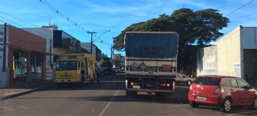 “Rua Santa Catarina, no centro de Campo Mourão, nesta terça-feira pela manhã, caminhão para em fila dupla para descarregar”.