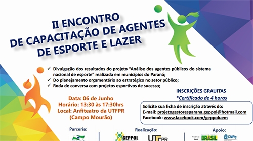 A UTFPR de Campo Mourão sedia no próximo dia 6 o 2º Encontro de Capacitação de Agentes de Esporte e Lazer. A promoção é da UEM e UTFPR, com apoio do Escritório Regional da SEET. O objetivo de capacitar gestores e agentes de esporte e lazer.