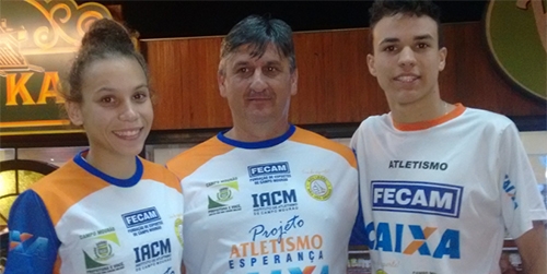Atletas de Campo Mourão voltaram a fazer bonito pelo Brasilzão agora. Agora foi no Campeonato Brasileiro sub-19, em São Bernardo do Campo/SP. A competição reuniu 104 equipes de todo o País e a Fecam ficou na 12ª posição. Mais: Jéferson Alberto foi ouro nos 1.500 metros e Pâmela de Carvalho nos 800 metros. Os dois atletas seguem no mês que para a Turquia, onde disputarão o Mundial Escolar. Olha os dois aí, com o técnico Paulo César Costa.