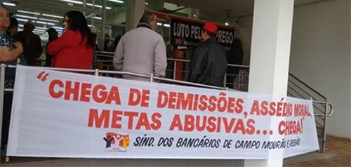 “Chega!”, dizia faixa colocada em frente ao banco. Segundo o sindicato, mesmo com altos lucros o banco não para de demitir. Em um ano foram quase três mil demissões em todo o País, graças ao fechamento de agências físicas e a abertura de “agências digitais”.