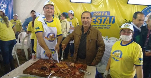 Cerca de 10 mil pessoas participaram neste domingo, em Goioerê, da 14ª Festa do Leitão Maturado. Olha o prefeito Beto Costa aí, fazendo pose ao lado do prato típico. Depois do almoço teve show com a dupla Antony & Gabriel.