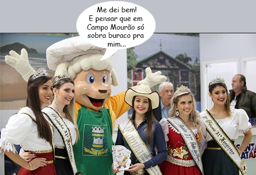 Olha aí mais um clic do 11º Festival de Turismo realizado semana passada em Foz do Iguaçu. O carneiro no buraco de Campo Mourão foi uma das atrações do evento. Quem se deu bem foi o carneirinho mascote. Ao lado dele, de chapéu, está a rainha da 26ª Festa Nacional do Carneiro no Buraco, Tátila Faria. As outras são rainhas e princesas de festas de Santa Catarina. Cá pra nós: a nossa é mais bonita...