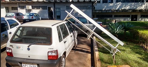 Alguém consegue achar uma explicação para um banco estar sobre um carro, desse jeito, em pleno pátio da prefeitura de Campo Mourão? A foto é da manhã desta quarta-feira e o veículo faz parte da frota oficial.