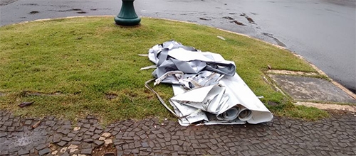 “Resto de fachada de loja é deixada sobre o canteiro central da av. Irmãos Pereira, no centro de Campo Mourão”.