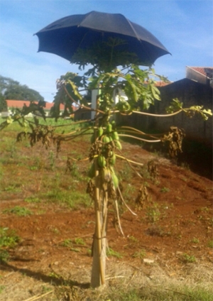 Morador coloca guarda-chuva para proteger da geada pé de mamão carregado. A cena é deste segunda-feira, na Vila Teixeira, nas proximidades do Parque do Lago, em Campo Mourão.
