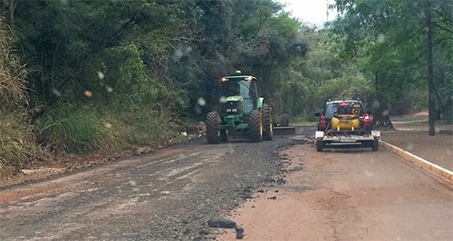Agricultor resolveu fazer por conta própria o tapa-buracos na estrada para o Barreiro das Frutas. O trator foi visto no trabalho nesta segunda-feira à tarde, próximo ao perímetro urbano de Campo Mourão.