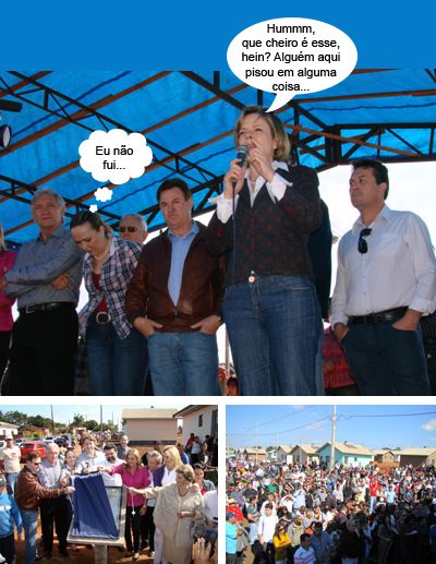 Os clic são de ontem, na inauguração das 426 casas do programa “Minha casa, minha vida”, em Campo Mourão. A senadora Gleisi Hoffman veio, mas não trouxer o marido-ministro Paulo Bernardo (Comunicação), não. Com o evento atrasou, ela nem pode ficar para o descerramento da placa. Estiveram por lá os deputados federais Zeca Dirceu e Nelson Padovani e os estaduais Marla Tureck, Enio Verri e Kleiton Kielse. O prefeito Nelson Tureck e o presidente do Águas Paraná, Marcio Nunes, também aparecem nas fotos.