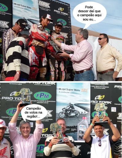 ENQUANTO ISSO, NO PARANAENSE DE MOTOCROSS... Os clics são de Boa Esperança, onde foi realizada ontem a terceira etapa do Campeonato Paranaense de Motocross. O evento encerrou a Semana Adrenalina. O deputado Douglas Fabrício esteve por lá, com direito a entregar troféus no pódio e tudo. O presidente da Comcam, Fábio D’Alécio (Ubiratã) também participou, além, é claro, do prefeito anfitrião Cláudio Gotardo. Olha ele aí, com o Douglas, erguendo troféu. Poderooooosos!...