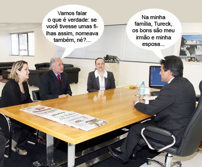 ENQUANTO ISSO, NO PALÁCIO DO GOVERNADOR... O clic foi feito ontem, no Palácio das Araucárias, em Curitiba, onde o prefeito Nelson Tureck manteve audiência com o governador Beto Richa. Tureck não foi sozinho, não. Estava com a filha-deputada Marla Tureck e com a filha-secretária Lilica Tureck (Saúde). Eles pediram um posto de saúde, dois ônibus e duas ambulâncias. Pra agradar, o prefeito convidou o governador pra Festa Nacional do Carneiro no Buraco.