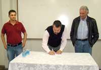 Pressão da Câmara à parte, o prefeito Nelson Tureck foi ontem à noite à Fecilcam, onde prestigiou a assinatura da ordem de serviço para reforma, adequação e compra de novos equipamentos para cinco laboratórios de informática da Fecilcam. O investimento é de R$ 398,5 mil, via governo federal. Olha aí o diretor Carlinhos Aleixo, o vice Eder Stela e o prefeito na hora da assinatura. E viva o Bill Gates!...